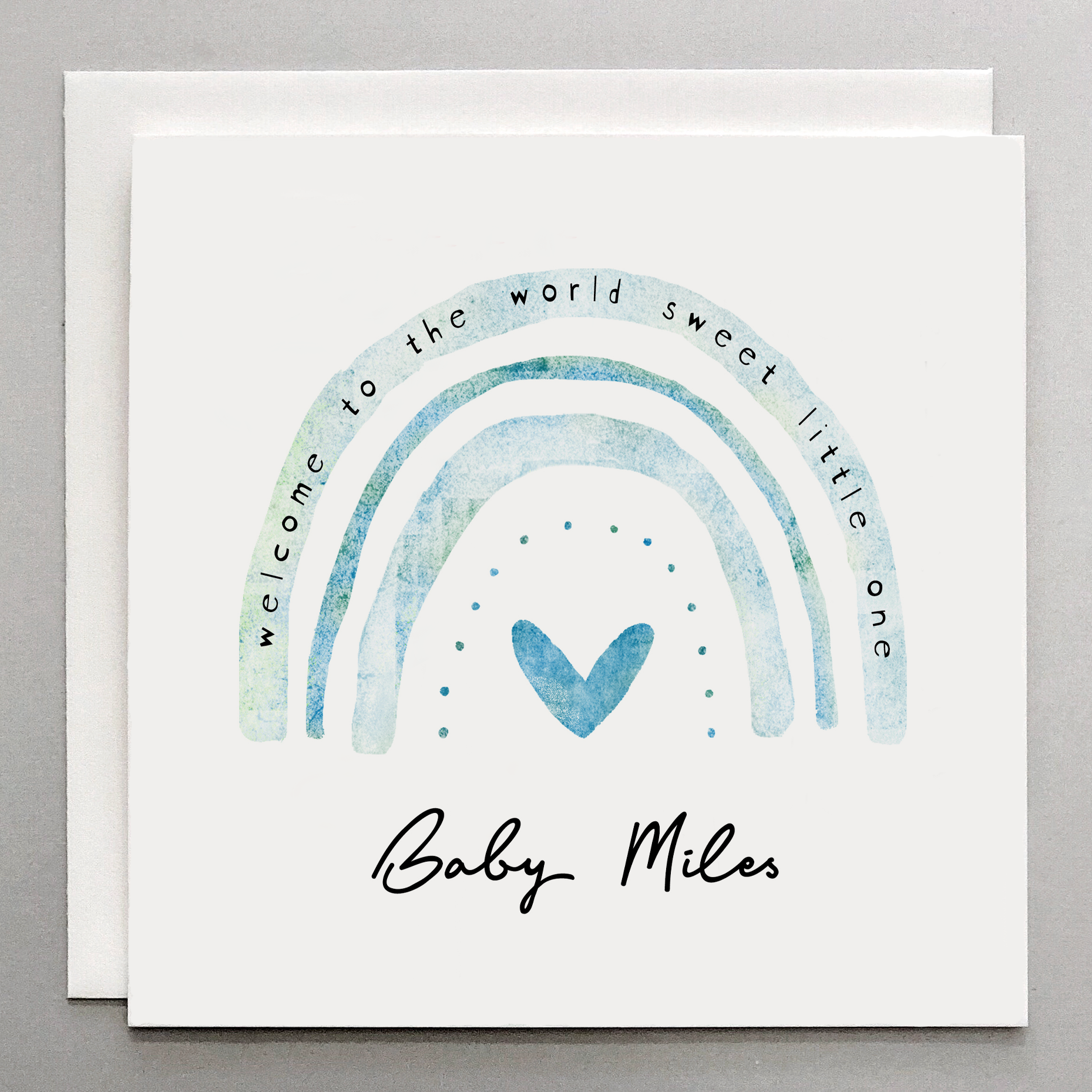 Cute personalized baby boy card featuring a blue-green watercolor rainbow heart. In the rainbow is the sentiment 'welcome to the world sweet little one'. Makes a sweet custom baby card, gift and small nursery art print.