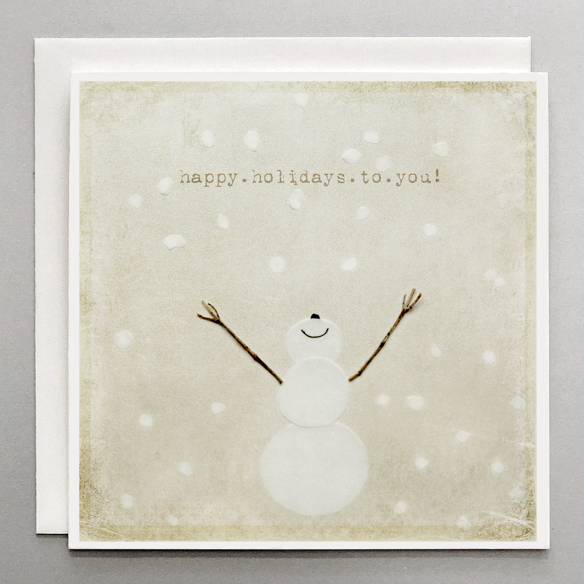 Christmas Holiday Card featuring a cheery smiling snowman with arms-up-in-air pointing to the sentiment - Happy Holidays To You!