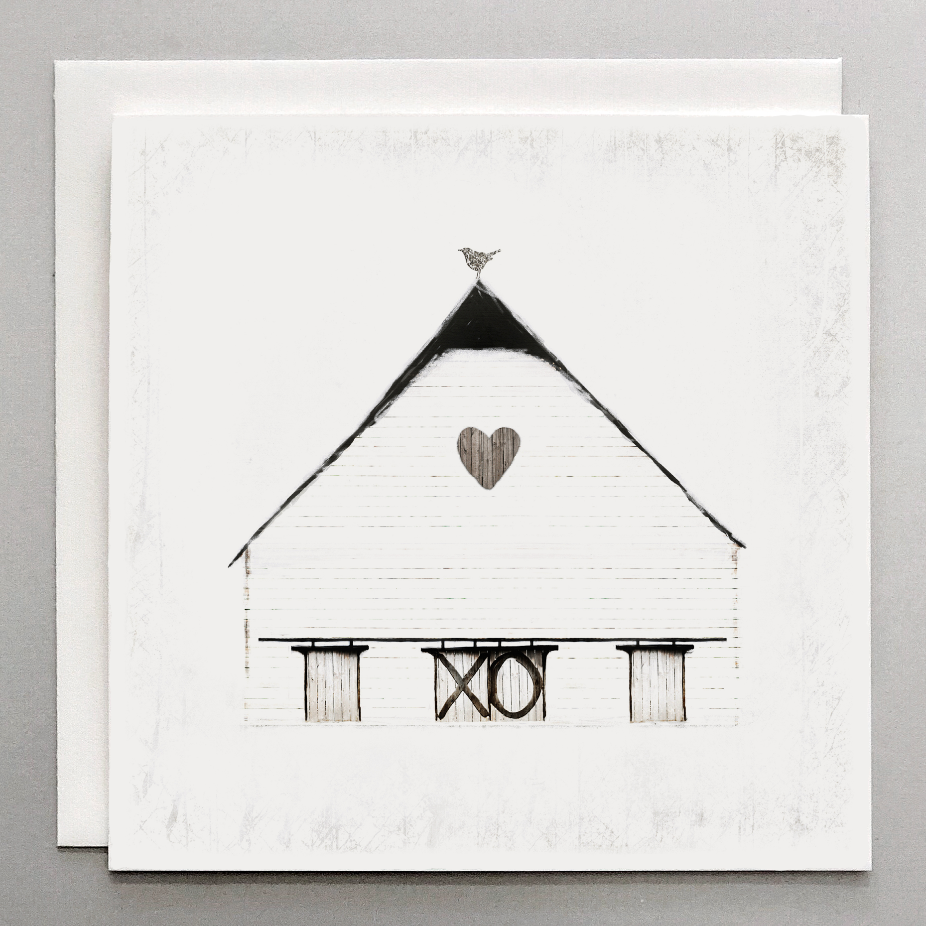 New Home Card with a rustic white barn with an 'xo' on the doors, wreath the shape of a heart and a little bird sitting on the rooftop. Printed on archival art paper made of 100% cotton.