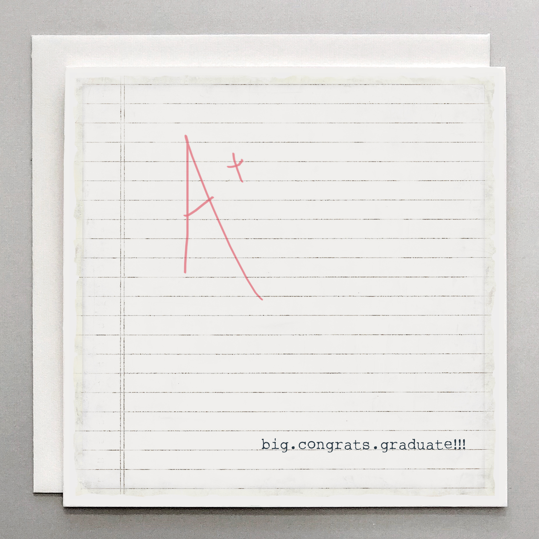 FUN GRADUATION CARD - celebrate your grad with this fun card 'big.congrats.graduate!!!' typed on school paper with a large red A+ grade. Woo-hoo!