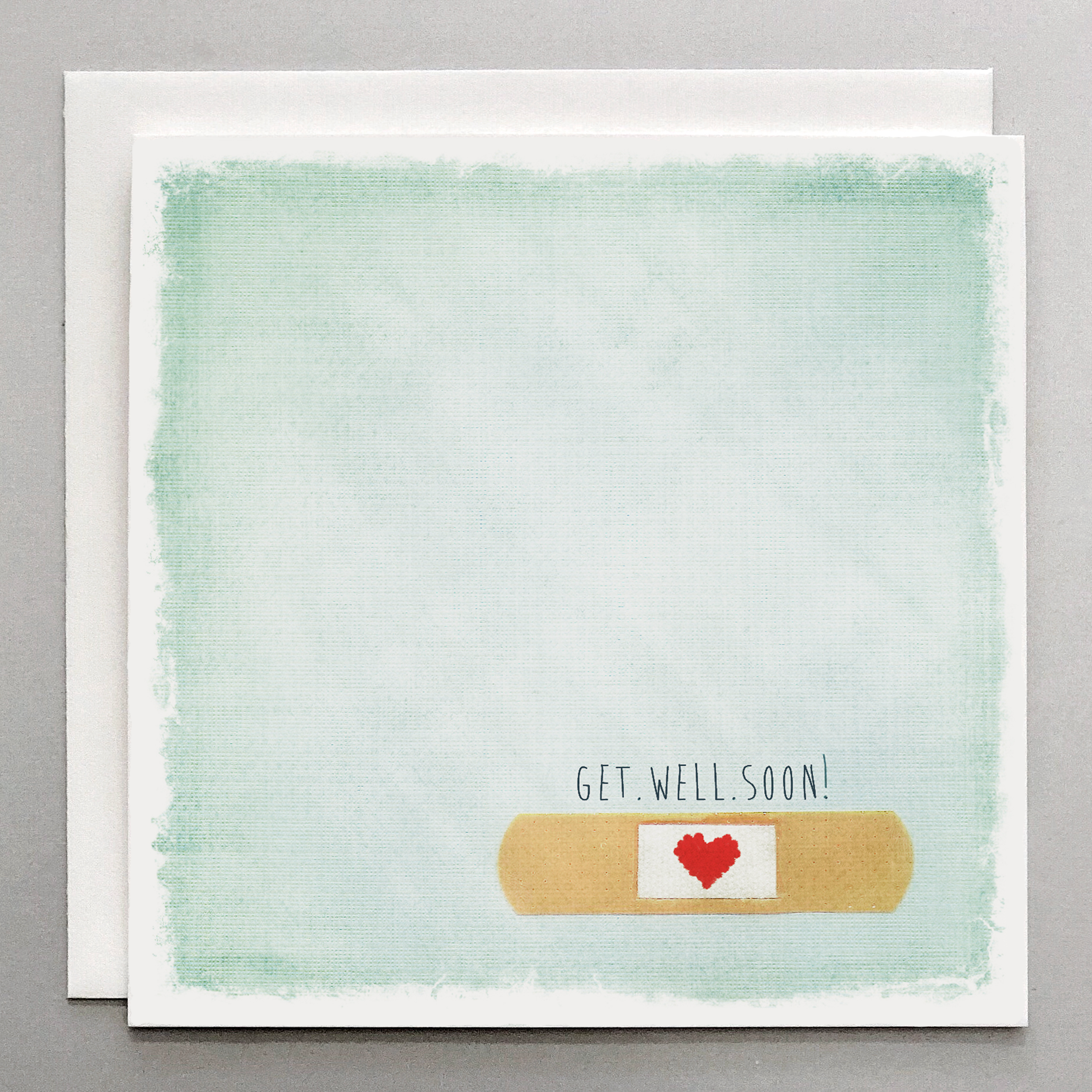 Sweet get-well card that features a bandaid with a red heart in the center that reads - 'get.well.soon.'