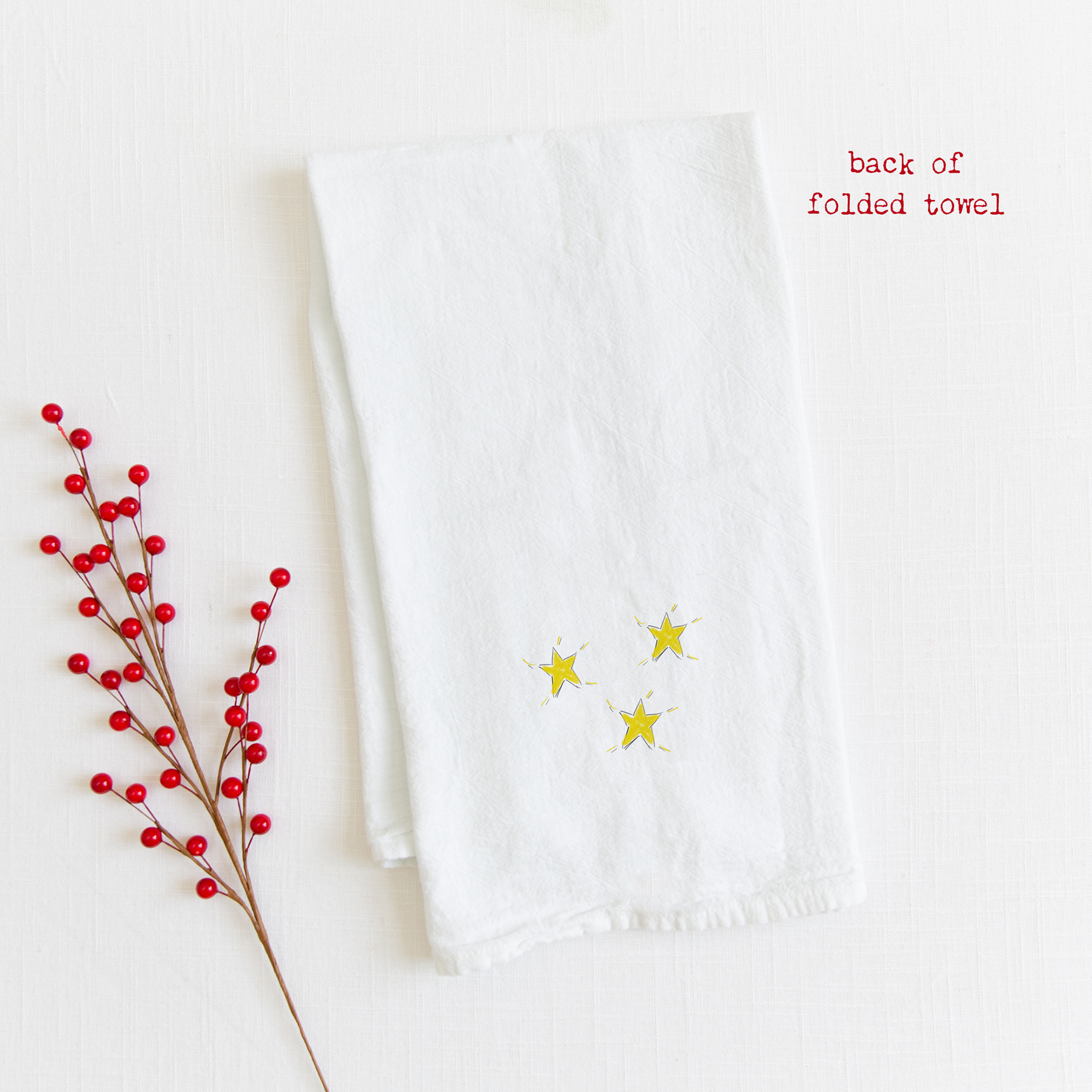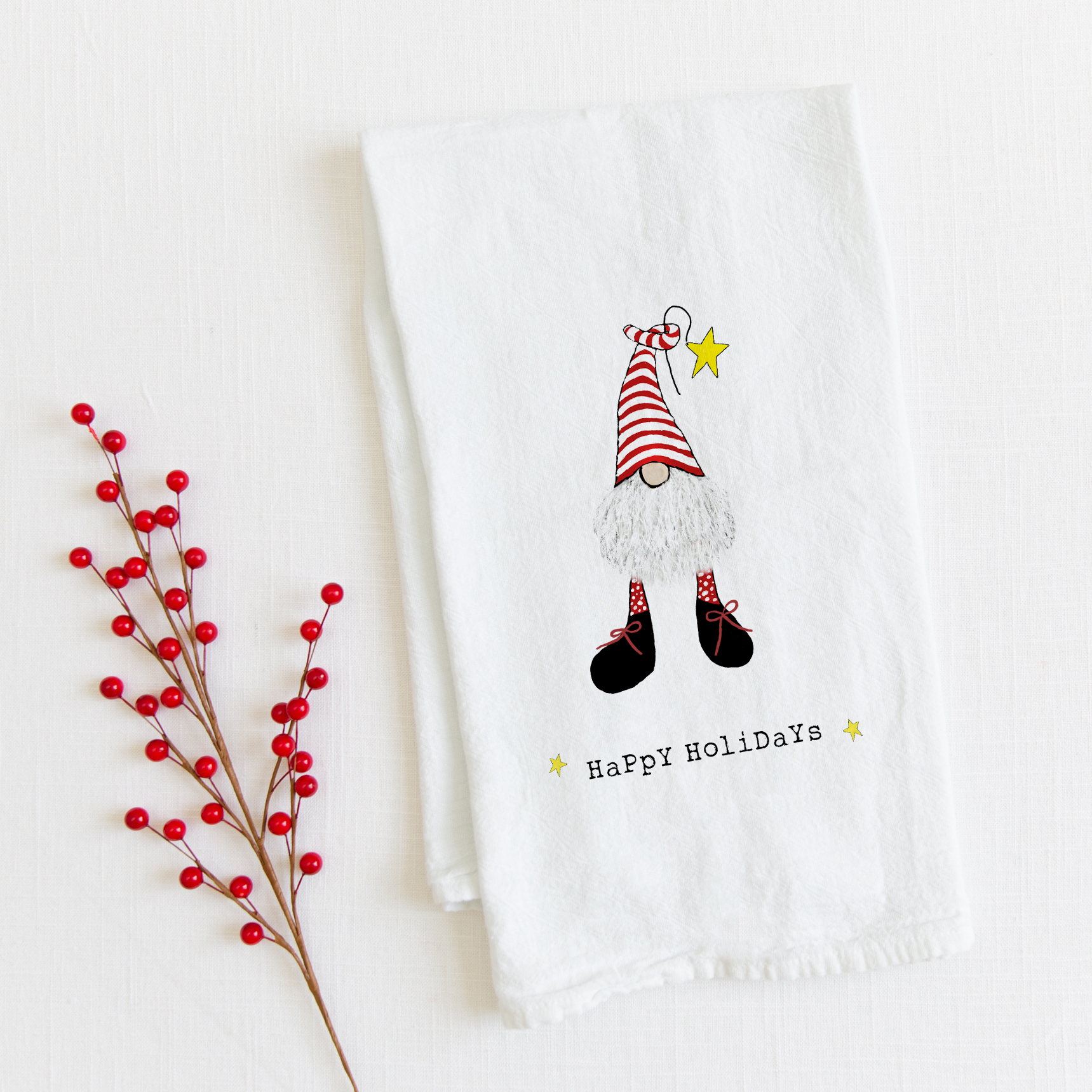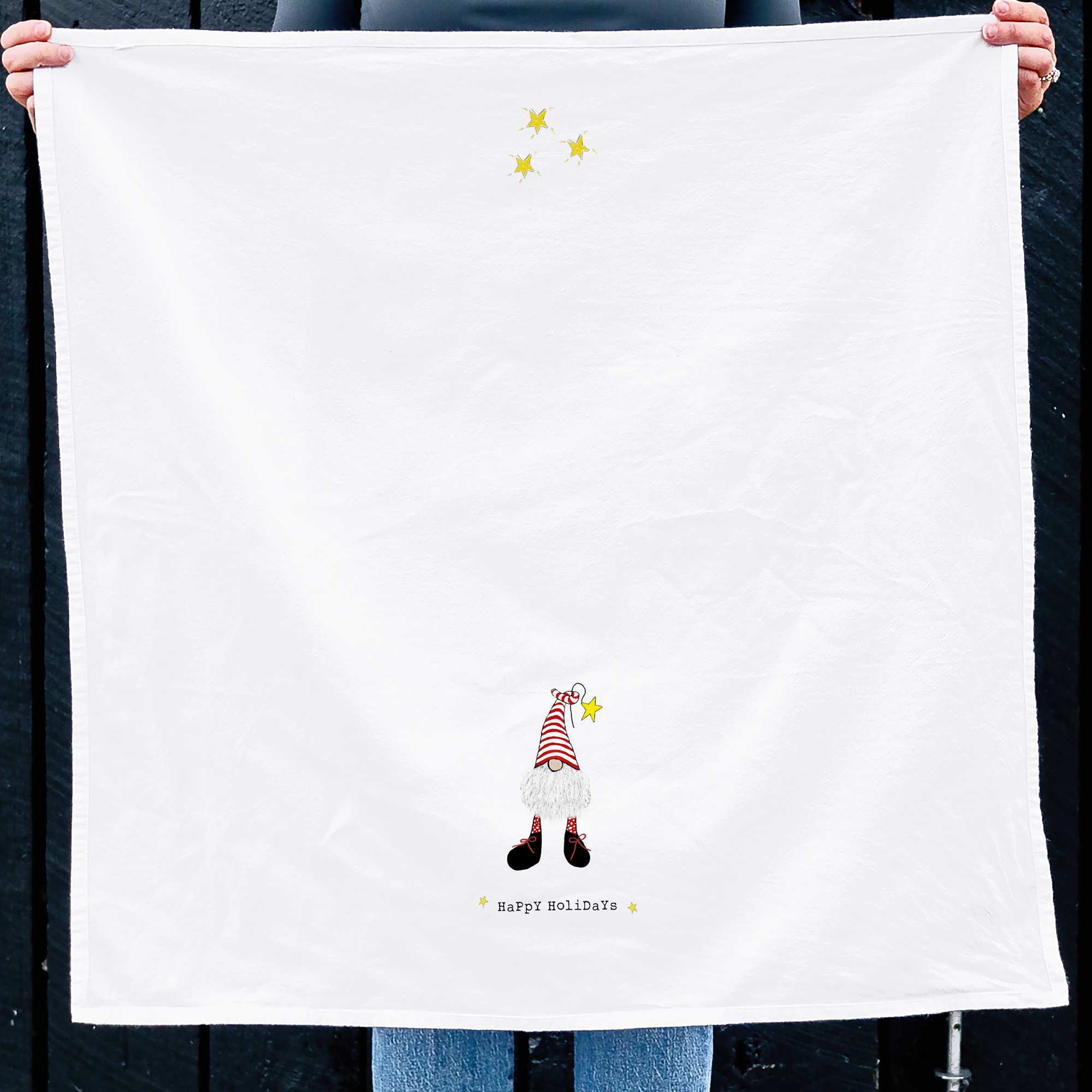 The front features a cheerful gnome holding a star and the words “Happy Holidays,” while three golden stars on the back add a touch of sparkle and joy. Made from soft, absorbent 100% cotton flour sack fabric, this towel blends charm and practicality for holiday baking, entertaining, or gifting.