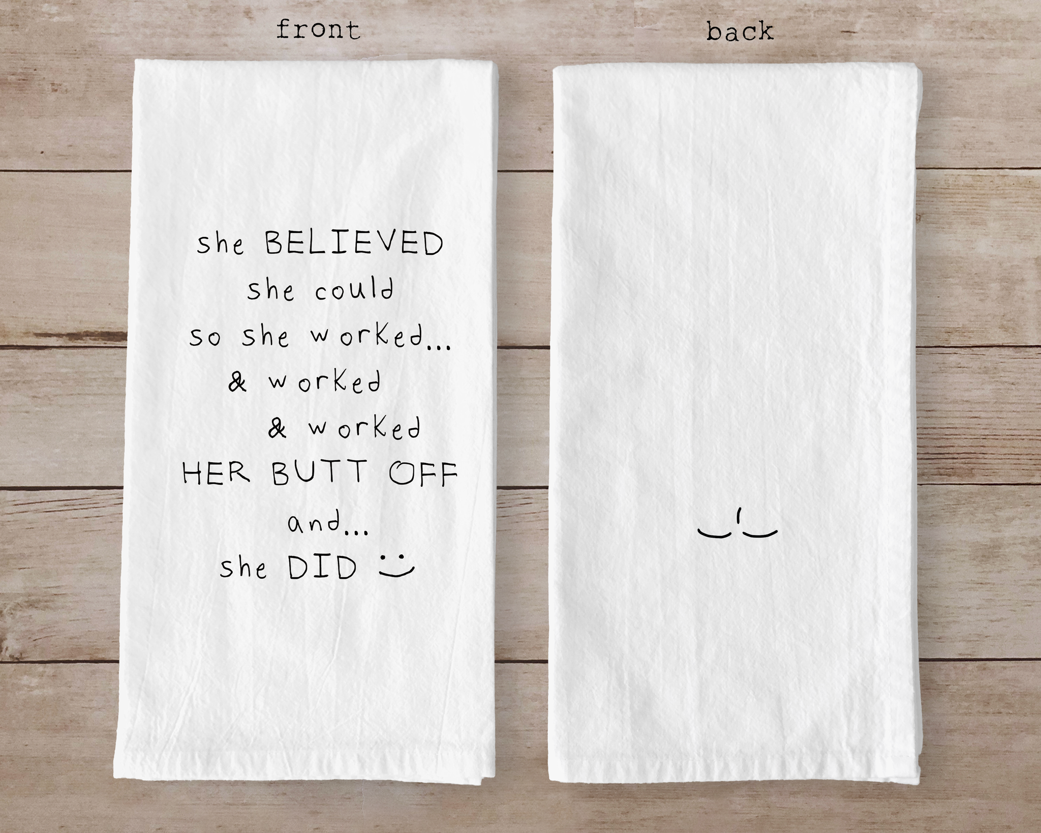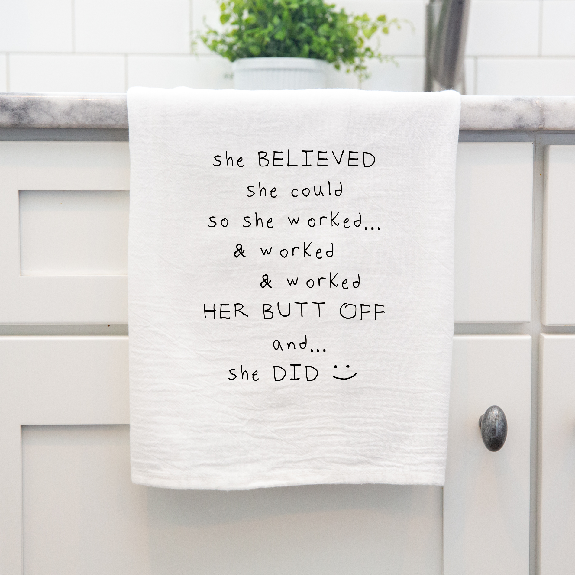 Bring humor and heart to the kitchen with our “She Believed She Could” tea towel.