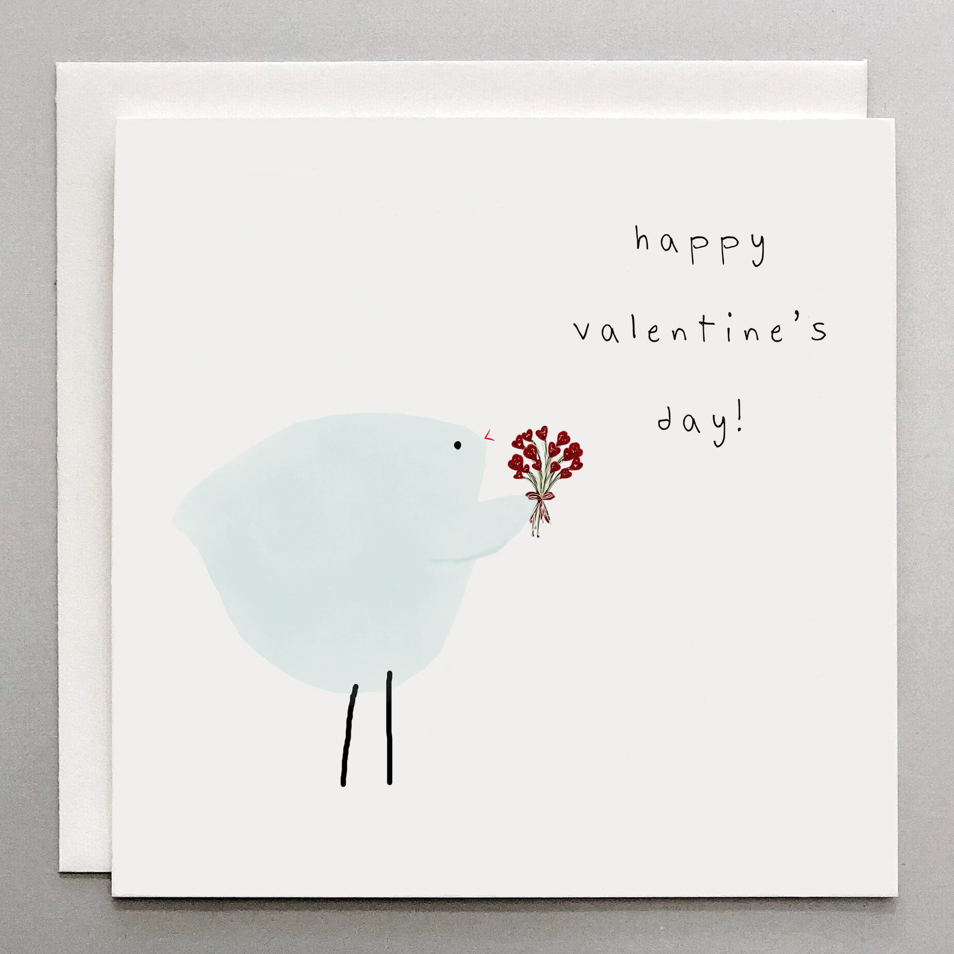 Valentine's Day Card: Cute blue bird holding a bouquet of red flowers. Printed on all cotton premium archival cardstock. Blank inside and ready for your own sentiment.