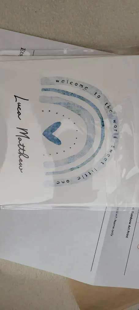 Cute personalized baby boy card featuring a blue-green watercolor rainbow heart. In the rainbow is the sentiment 'welcome to the world sweet little one'. Makes a sweet custom baby card, gift and small nursery art print.